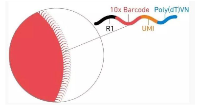 Illumina TruSeq Read 1测序引物,用于后续的上机测序。16 nt的细胞识别条形码有400万种细胞识别条形码,一个凝胶珠仅含有一种细胞识别条形码,通过这400万种条形码,从而将其对应的细胞区分开。12 bp的RNA独立分子标签是由随机碱基组成的一段序列,捕获到的每一个核酸分子都将分配有特异的UMI序列,能够区分哪些reads是来自于一个原始RNA分子,从而区分基因片段是否为PCR的扩增重复及区分是真实的单核苷酸多态性(SNP)位点还是PCR产生的突变。30bp的Poly(dT)反转录引物,是含有30个T碱基的同聚DNA片段,用于捕获有polyA尾的转录本。