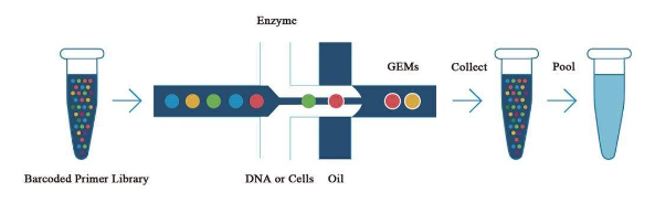 10X单细胞平台采用基于微滴条形码分配系统,该系统为样本提供了百万级的携带唯一DNA条形码的凝胶珠,再结合微流控技术,将带有条形码和引物的凝胶珠与单细胞悬液中的细胞包裹在油包水的液滴(GEMs)中。