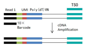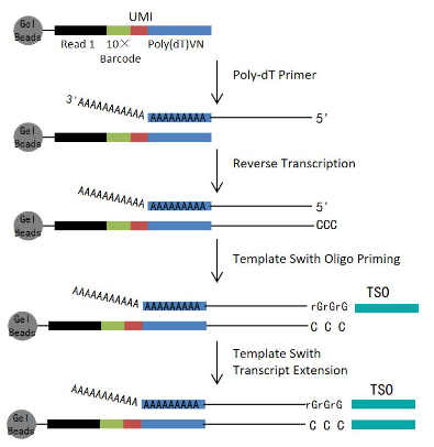 1.油滴形成后,凝胶珠在油滴内溶解并释放大量探针,细胞裂解释放mRNA,mRNA与油滴内的探针结合并在逆转录酶的作用下产生用于测序的带有细胞标签和UMI信息的cDNA一链,再以SMART扩增方法完成第二链合成。
