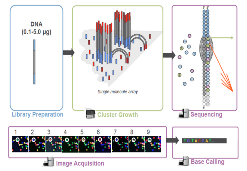 库检合格后,把不同文库按照有效浓度及目标下机数据量的需求pooling后进行Illumina测序。测序的基本原理是边合成边测序(Sequencing by Synthesis)。在测序的flow cell中加入四种荧光标记的dNTP、DNA聚合酶以及接头引物进行扩增,在每一个测序簇延伸互补链时,每加入一个被荧光标记的dNTP就能释放出相对应的荧光,测序仪通过捕获荧光信号,并通过计算机软件将光信号转化为测序峰,从而获得待测片段的序列信息。测序过程如下图所示: