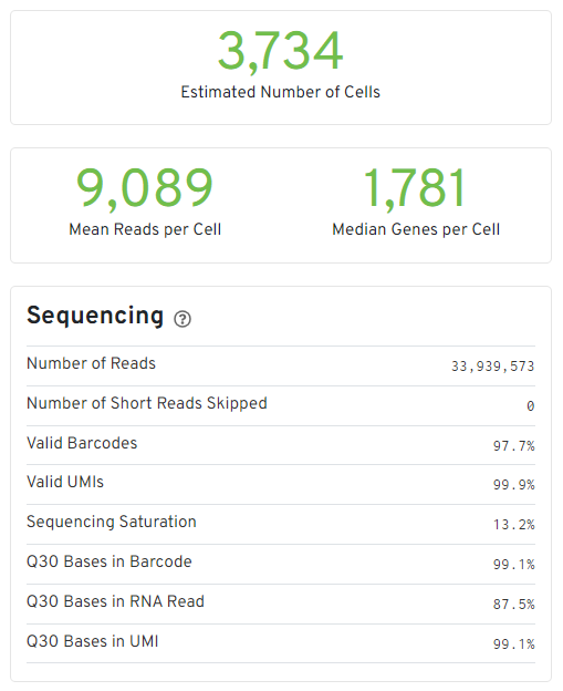 (1) CellRanger网页版分析报告。包括异常结果警报,细胞和基因数目的评估,比对比例统计及部分基础分析的结果。