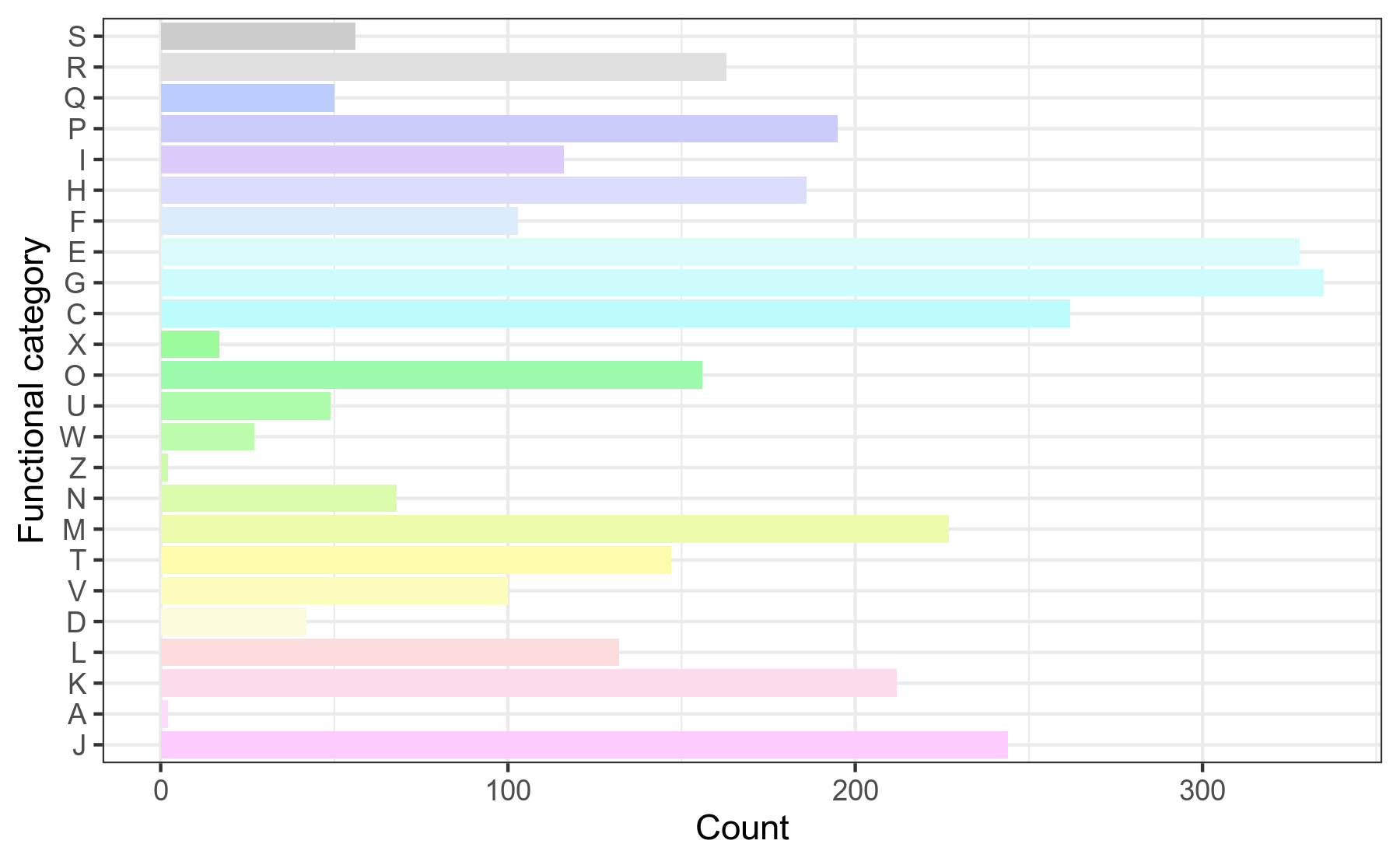COG,即Clusters of Orthologous Groups of proteins(直系同源蛋白簇)。COG是由NCBI创建并维护的蛋白数据库,根据细菌、藻类和真核生物完整基因组的编码蛋白系统进化关系分类构建而成。每一簇COG由直系同源蛋白序列构成,通过比对可以将某个蛋白序列归到某一个已知功能的COG中,从而可以推测该未知功能的蛋白的功能信息。 我们对基因组prokka注释结果中的.tsv文件,提取COG注释信息,然后用R语言做分类统计。