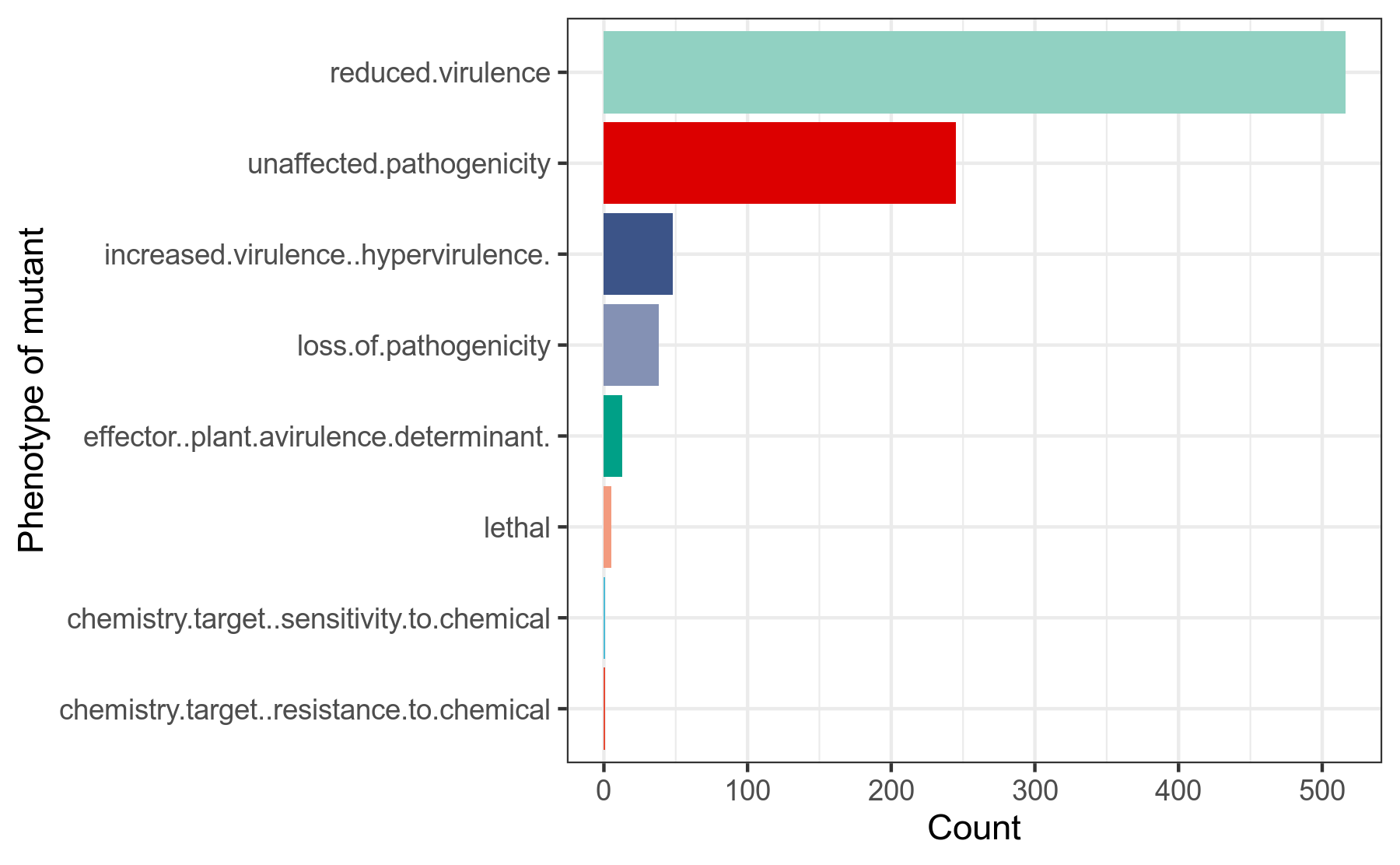 我们使用diamond蛋白序列比对工具,将细菌基因组prokka注释结果中的.faa文件的基因蛋白序列作为query查询序列,到PHI[24]数据库做比对搜索,得到在病原-宿主相互作用中发挥作用的基因,在人为突变后的菌株表型的相关信息,用R语言做分类统计。