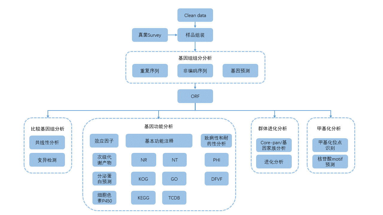 真菌精细图分析对三代测序数据和二代测序数据进行组装,获得真菌全基因组序列,并使用基因组组分分析、 基因功能分析、比较基因组分析、群体进化分析和甲基化分析等分析方法,对真菌基因组相关信息进行全面、详尽地了解。