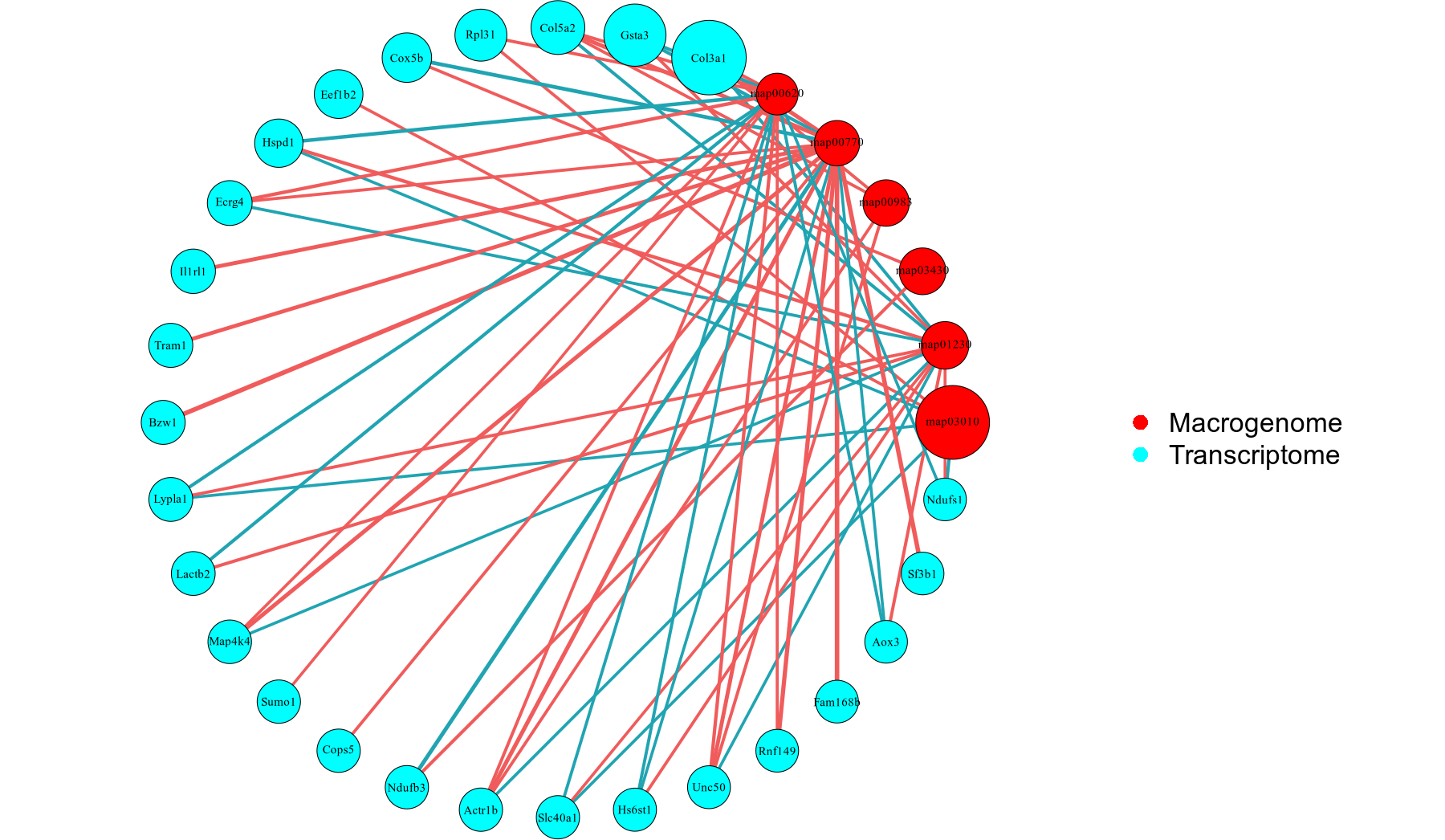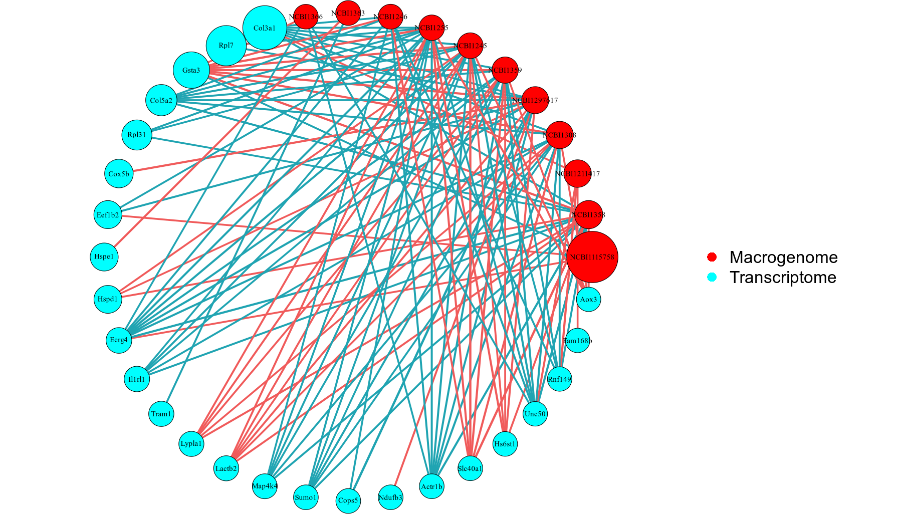 网络图展示了宿主基因和宏基因组物种注释或者功能注释之间的关联关系,每个节点代表一个宿主基因或物种/功能注释,而连线表示它们之间的关联;网络图能够发现宿主基因和微生物之间的正负相关关系,有助于解释宿主与微生物的关系。使用的R包包括psych,igraph。