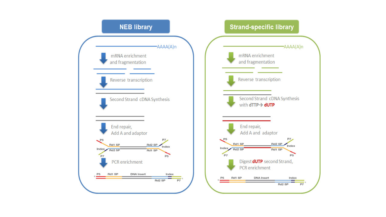 mRNA的获取主要有两种方式:一是利用真核生物大部分mRNA都带有polyA尾的结构特征, 通过Oligo(dT)磁珠富集带有polyA尾的mRNA。二是从总RNA中去除核糖体RNA, 从而得到mRNA。随后在NEB Fragmentation Buffer中用二价阳离子将得到的mRNA随机打断, 按照NEB普通建库方式或链特异性建库方式进行建库。(图2.2)。