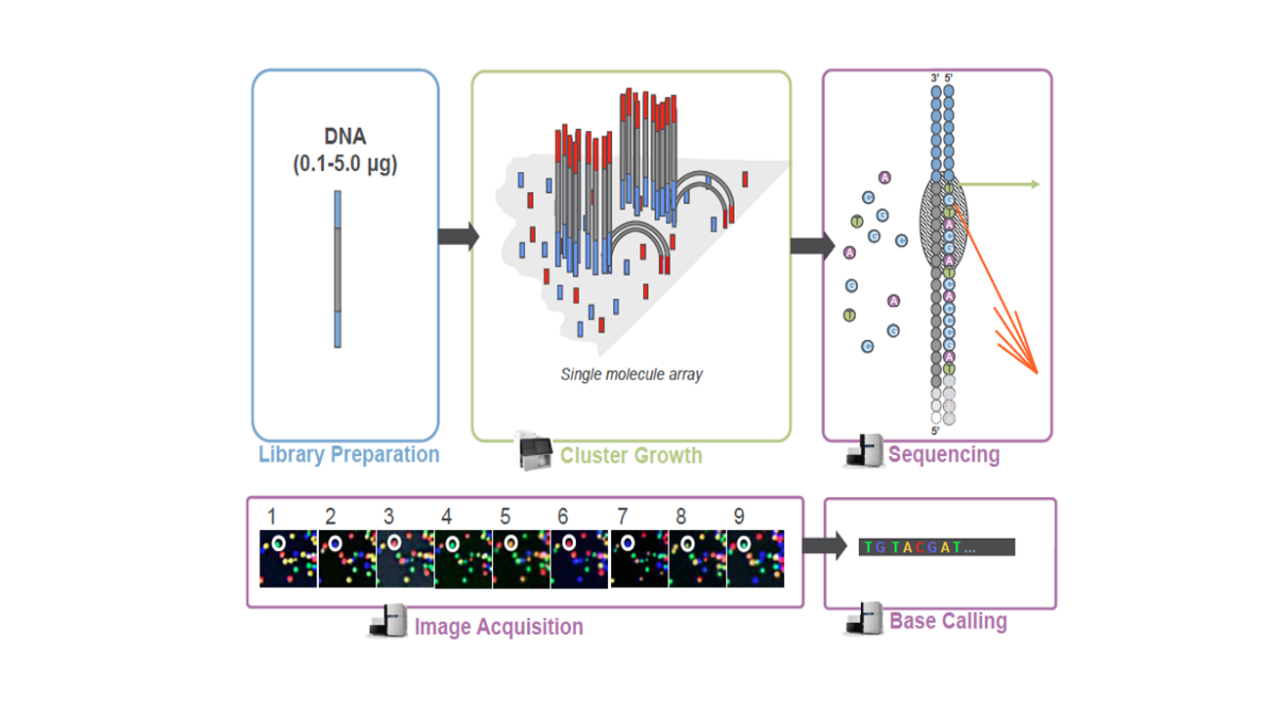 库检合格后,把不同文库按照有效浓度及目标下机数据量的需求pooling后进行Illumina测序。 测序的基本原理是边合成边测序(Sequencing by Synthesis)。 在测序的flow cell中加入四种荧光标记的dNTP、DNA聚合酶以及接头引物进行扩增, 在每一个测序簇延伸互补链时,每加入一个被荧光标记的dNTP就能释放出相对应的荧光, 测序仪通过捕获荧光信号,并通过计算机软件将光信号转化为测序峰, 从而获得待测片段的序列信息。测序过程如下图所示。