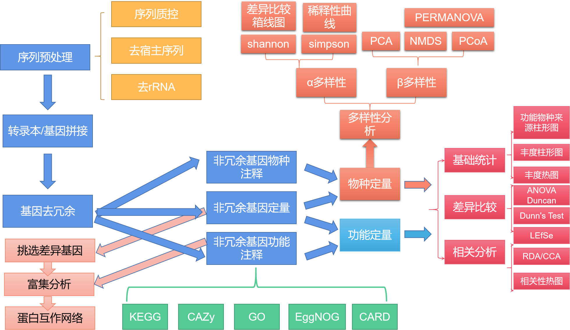 总的来说,在对原始数据进行预处理(质控去宿主,去rRNA), 转录本拼接,基因去冗余,非冗余基因定量, 获得基因丰度表之后,有三条分析路线:1. 挑选差异表达基因,差异基因富集分析,差异蛋白互作网络分析; 2. 结合非冗余基因功能注释结果(KEGG, GO, CARD, CAZy, EggNOG)进行功能定量,然后进行功能基础统计,差异比较,相关性分析; 3. 结合非冗余基因物种注释结果进行物种定量,然后进行物种基础统计,差异比较,相关性分析,多样性分析(α多样性,β多样性)