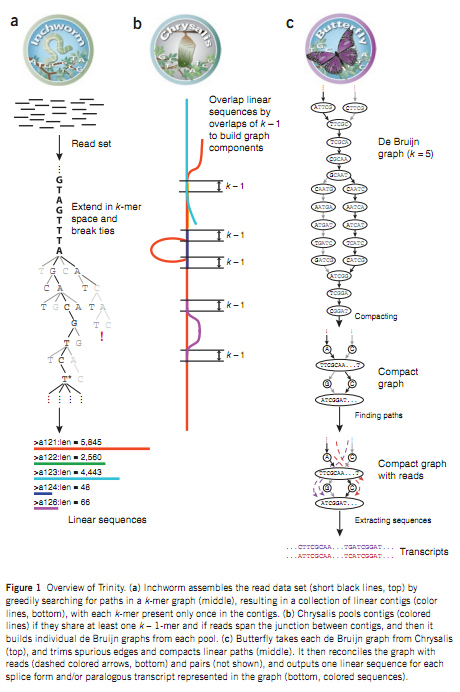 Trinity是一款由 Broad Institute 和 Hebrew University of Jerusalem合作研发的, 针对RNA-seq数据的,高效稳定的转录组拼接软件。 其结合了三个独立的软件模块依次对大量的RNA-seq数据进行了处理拼接,分别为: 茧(Inchworm)、蛹(Chrysalis)、蝶(Butterfly)[3]。主要过程如下: