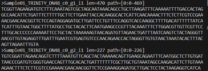 其中大于号>后紧跟转录本的id号,len=后面为转录本的长度,即该转录本的碱基数, path为从 de Bruijn Graph subComponent中经历的路径。 其后为该转录本的碱基序列。每个转录本的id号包括多个字段(下划线隔开), 第一个字段为样本ID(如图中的Sample01),最后三个字段为c_g_i: 其中 "c" (如图中的TRINITY_DN48_c0)为拼接过程形成的 de Bruijn Graph Component;g为subcomponet, 可以看作为广泛意义上的gene;i代表转录本isoform(一个基因可以有多个转录本)。 即:c_g为基因ID,c_g_i为c_g基因不同的转录本。 详细解释见Trinity官方网站: https://github.com/trinityrnaseq/trinityrnaseq/wiki