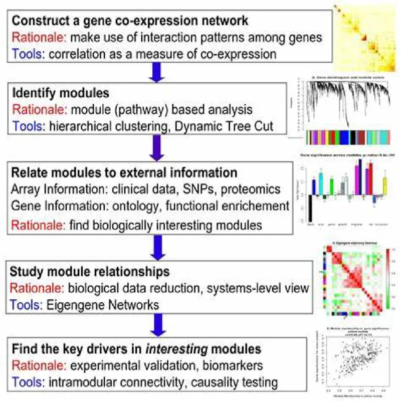 加权基因共表达网络分析 (WGCNA)是用来描述不同样品之间基因关联模式的系统生物学方法,可以用来鉴定高度协同变化的基因集, 并根据基因集的内连性和基因集与表型之间的关联鉴定候补生物标记基因或治疗靶点。相比于只关注差异表达的基因,WGCNA利用全部基因的信息识别感兴趣的基因集,并与表型进行显著性关联分析。
