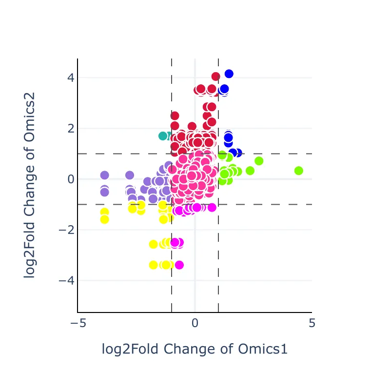 制表符分隔的文本文件表格;该文件至少需包含两个组学的log2 Fold Change列,并分别命名为omics1_log2fc和omics2_log2fc。