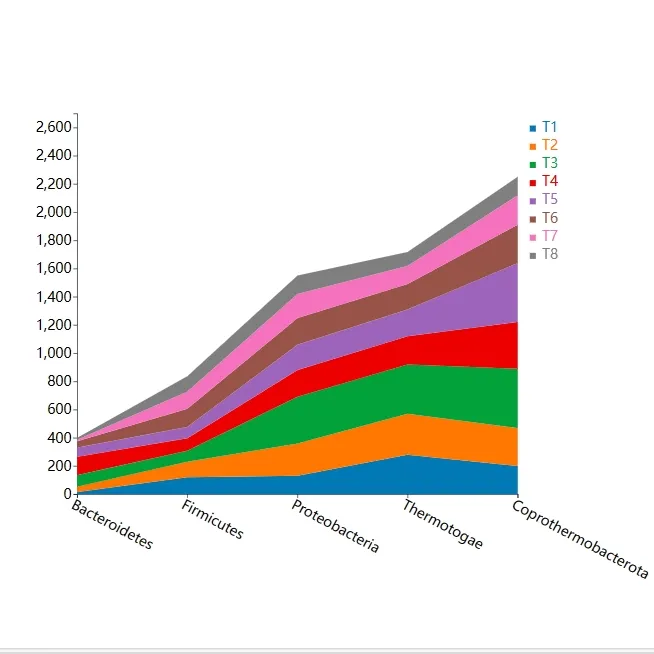 堆叠连线河流图是河流图和堆叠面积图的结合, 通常用于多组学中。它能够准确地展示不同元素占比的同时,也能直观感受元素在不同样本间的占比增减趋势变化